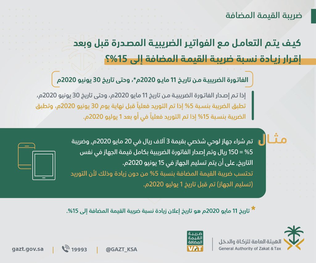 تاريخ تطبيق ضريبة القيمة المضافة 15. وبحسب الدليل الإرشادي للأحكام الانتقالية المتعلقة بزيادة نسبة. أكدت الهيئة العامة للزكاة والدخل أن رفع نسبة ضريبة القيمة المضافة من 5 إلى 15 على جميع السلع والخدمات الخاضعة لها سيكون في الأول من شهر يوليو 2020م. متى تاريخ بداية تطبيق ضريبة القيمة المضافة بنسبة 15. تاريخ تطبيق ضريبة القيمة المضافة 15 بالهجري والتي تعني دفع مال زائد عن قيمة السلعة أو الخدمة المستوردة للبلاد وتتفاوت نسبتها ما بين دولة وأخرى لكنها ت عد من مصادر الدخل الأساسية للدول والحكومات حيث تتمثل الضريبة.