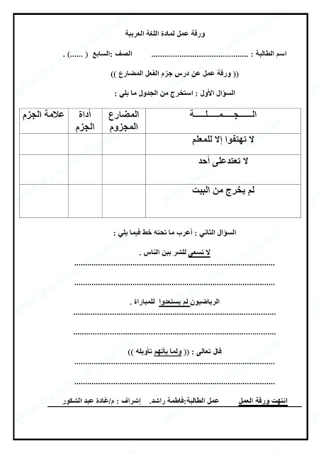 ورقة عمل جزم الفعل المضارع لمادة اللغة العربية الصف السابع الفصل الثالث منتديات صقر الجنوب
