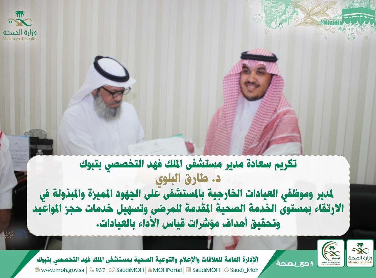 إعــلانـات تـبوگ On Twitter تكريم سعادة مدير مستشفى الملك فهد التخصصي بتبوك الدكتور طارق البلوي لمدير وموظفي العيادات الخارجية بالمستشفى على الجهود المبذولة في الإرتقاء بمستوى الخدمة الصحية المقدمة للمرضى